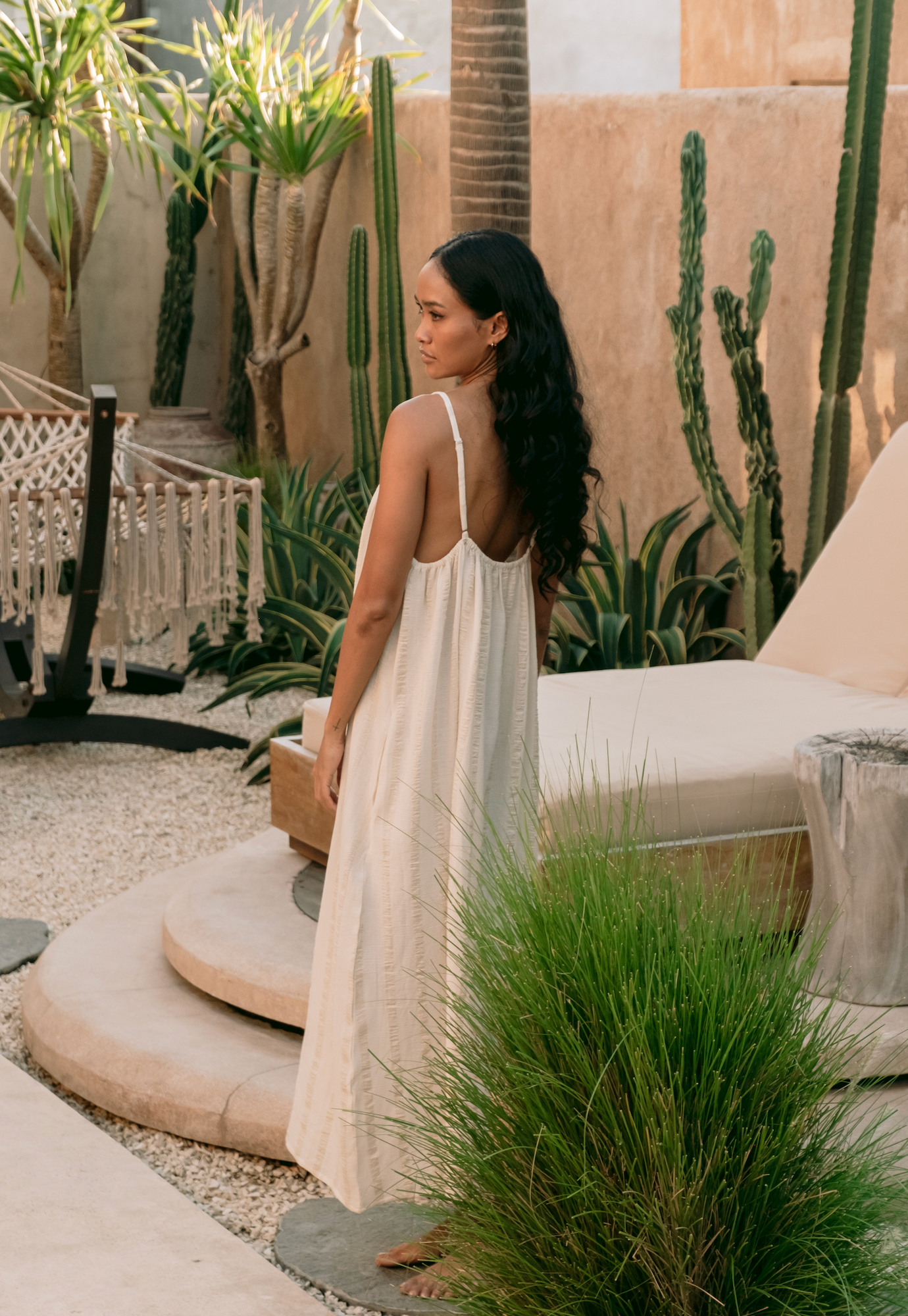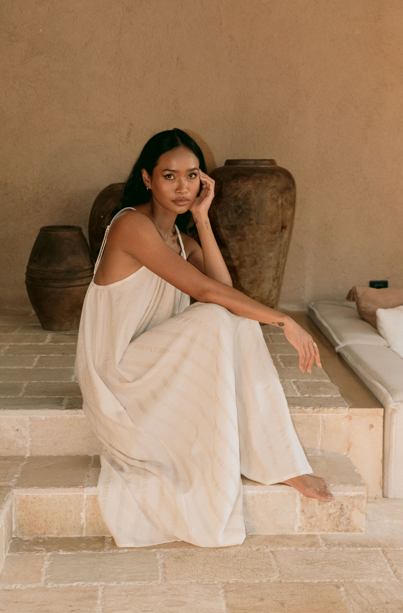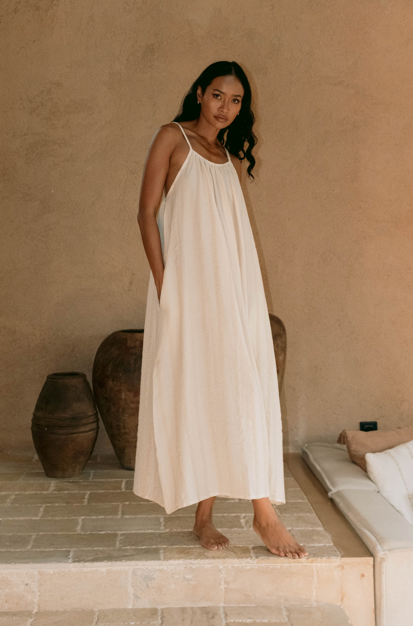 A breezy sleeveless dress crafted from soft cotton, designed with a loose, flowing fit. Lightweight and effortless, it’s perfect for beach days, resort getaways, and warm summer evenings.