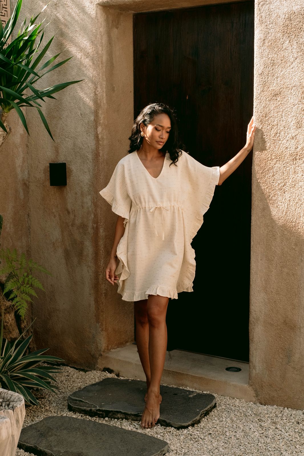 Breezy and effortlessly elegant, this tunic is crafted from breathable cotton in Türkiye. Gentle ruffles along the sleeves and hem create a subtle, flowing movement, while a delicate drawstring at the waist allows for a perfect, relaxed fit.
